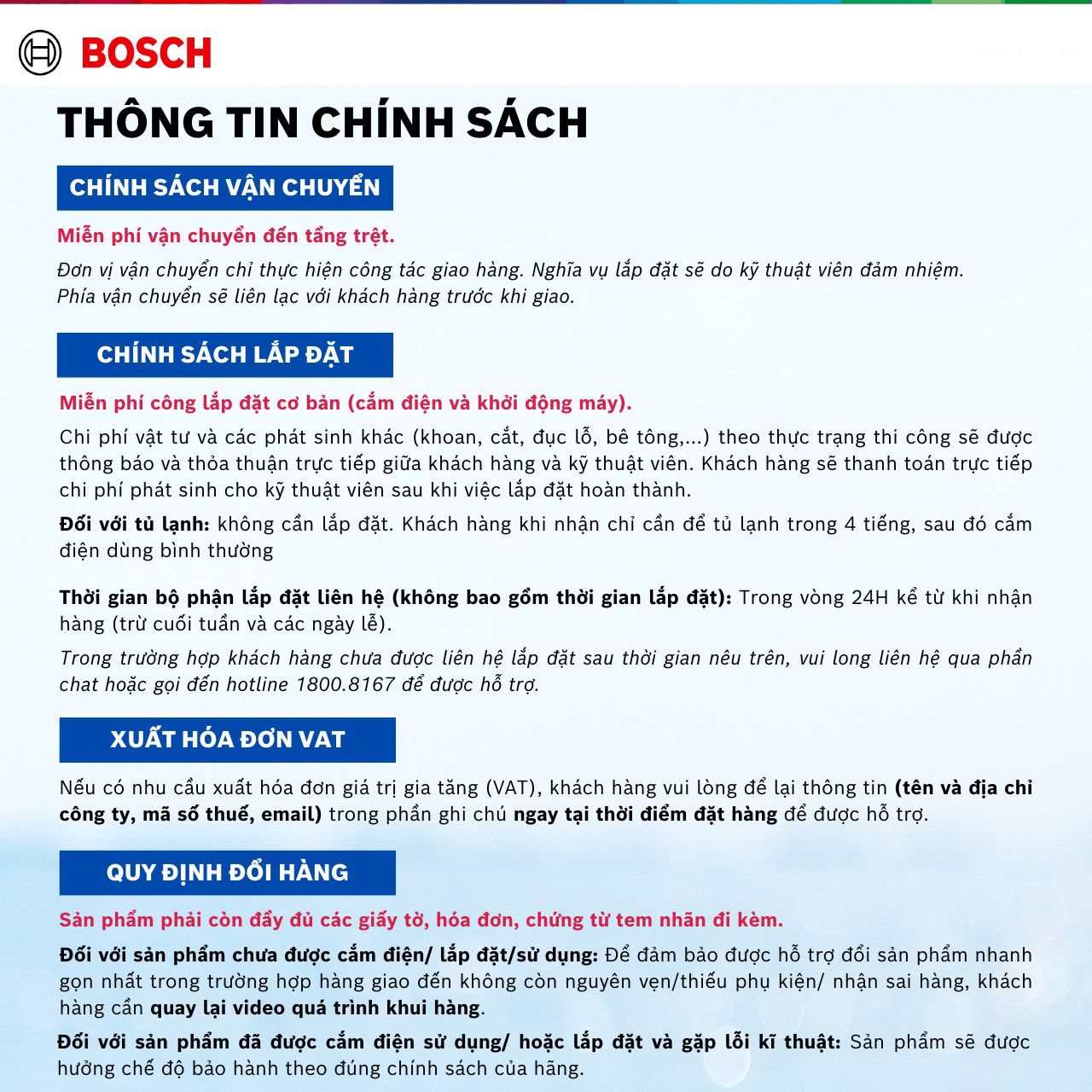 Ghi chú: BSH VN không hỗ trợ lưu kho. Nếu quý khách muốn lưu kho 10-15 ngày, vui lòng ghi chú ngày nhận trong đơn hàng. Trường hợp không có ghi chú hoặc không cập nhật thông tin khi được xác nhận, hàng sẽ được gửi đi và được tính như Hãng đã hỗ trợ chi phí vận chuyển. Nếu quý khách hẹn lại ngày giao, hàng sẽ được hoàn về kho K-HOMÈS và giao lại sau với phí vận chuyển phát sinh. Để đảm bảo quyền lợi, quý khách vui lòng kiểm tra kỹ nhu cầu trước khi đặt hàng và ghi chú đầy đủ thông tin cần thiết.