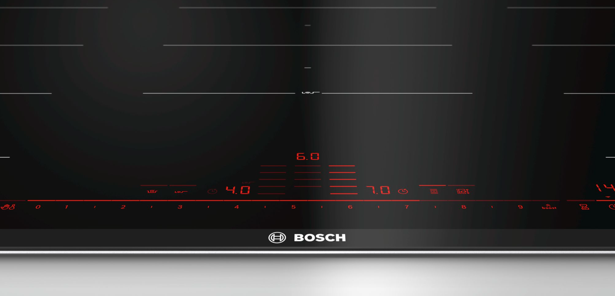 Bếp từ Bosch PXX975DC1E được trang bị bảng điều khiển cảm ứng DirectSelect Premium sang trọng, với thiết kế kiểu đèn LED ẩn dưới mặt kính. Khi tắt bếp bảng điều khiển sẽ tắt đi cùng với cảm ứng rộng rãi giúp thao tác trở nên thuận tiện hơn trong việc kiểm soát bếp. Bếp có tới 17 cấp độ công suất khác nhau, cùng với giao diện dễ đọc, cảm biến nhạy giúp bạn dễ dàng thao tác. Việc của bạn chỉ cần chọn vùng nấu và thiết lập công suất nhanh chóng chỉ với một lần chạm. Giao diện bảng điều khiển sẽ tự động ẩn đi khi bạn tắt bếp. Với thiết kế bảng điều khiển ẩn giúp người dùng lau chùi mà không sự làm mờ các nút nhấn.