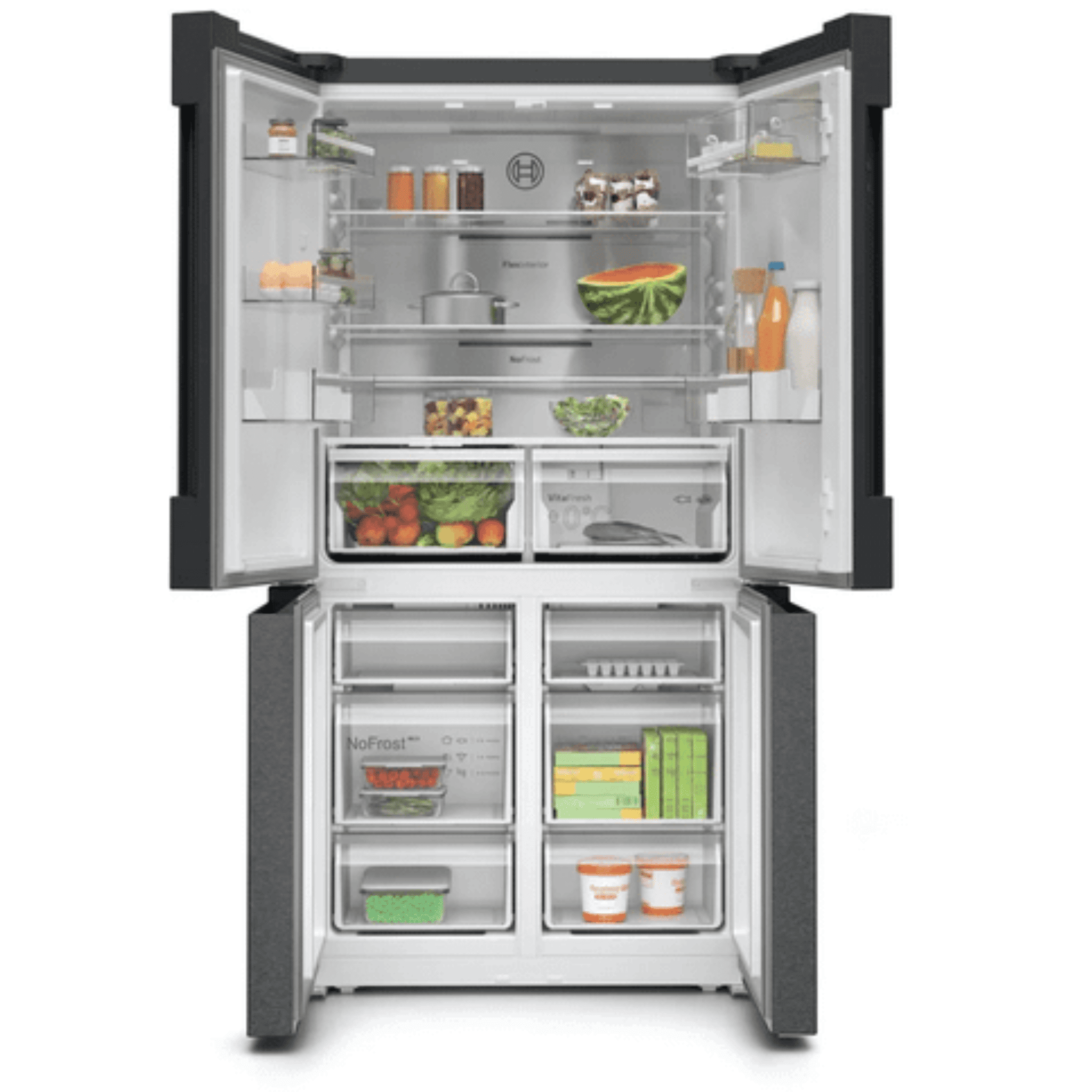 Bosch KFN96AXEA sở hữu thiết kế 4 cửa hiện đại với bề mặt thép không gỉ chống bám vân tay, tạo điểm nhấn sang trọng và hài hòa với mọi không gian nội thất bếp. Các cửa tủ đóng mở độc lập, giúp dễ dàng tìm kiếm và lấy thực phẩm mà không làm thất thoát hơi lạnh. Không gian lưu trữ rộng rãi, bố trí khoa học, tối ưu hóa diện tích sử dụng cho gia đình đông thành viên.